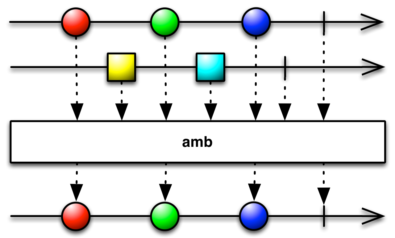 Amb Operator Overview Given two or more source Observables, emit all of the items from only the first of these Observables to emit an item. Example observable := rxgo.Amb([]rxgo.Observable{ rxgo.Just(1, 2, 3)(), rxgo.Just(4, 5, 6)(), }) Output: 1 2 3 or 4 5 6 Options WithBufferedChannel WithContext WithObservationStrategy WithErrorStrategy