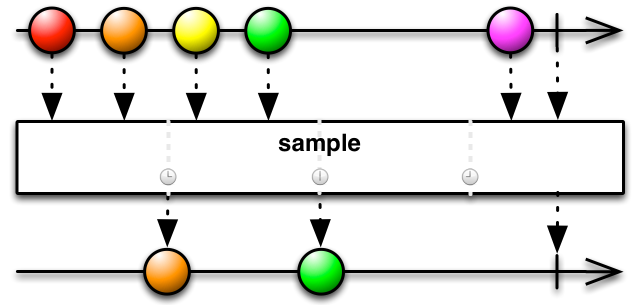 Sample Operator Overview Emit the most recent item emitted by an Observable within periodic time intervals. Example sampledObservable := observable1.Sample(observable2) Options WithBufferedChannel WithContext WithPublishStrategy