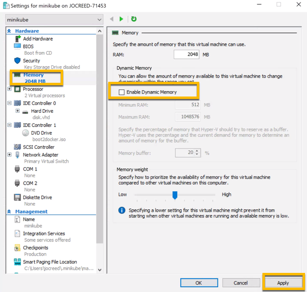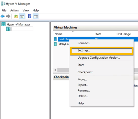 minikube stopStep 6 : Once minikube has stopped, open the Hyper-V Manager again and right click on the minikube VM and select settings.