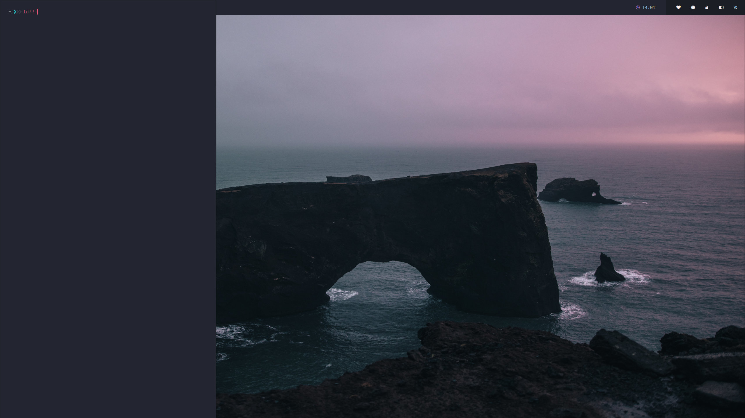 Status bar | Workspace info, layout info, launchers, DPMS toggling, mpris2 info, time, volume, power |