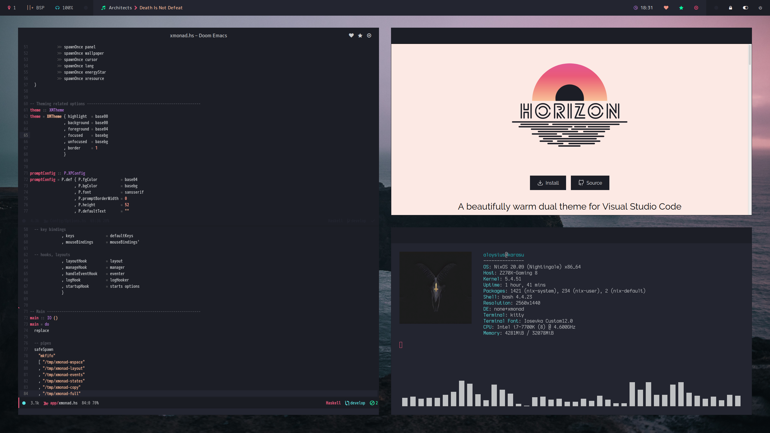 This XMonad configuration is my attempt at making it feel more like a desktop environment. This means a lot more mod-cons than you typically find in a tiling WM. You will also need my polybar configuration, available in my nix-overlay, as well as all of the supporting scripts available here.